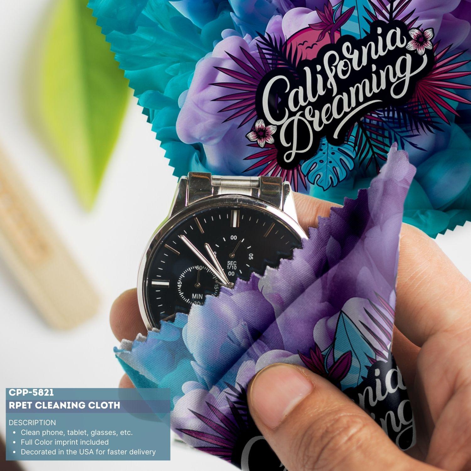Experience the ultimate in cleanliness with our eco-friendly phone, tablet, and glasses accessories, all crafted from recycled PET materials. Each item features a high-quality full-color imprint, adding a touch of personalization to your everyday essentials. Plus, our products are proudly decorated in the USA, ensuring quick and efficient delivery to your doorstep. Complies with Prop 65. 5″ L x 5″ H
